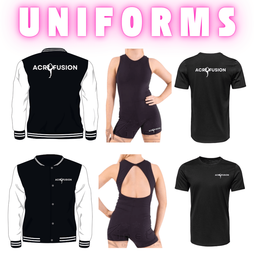 - ACRO FUSION have a studio unitard that is available to purchase. This is not compulsory for classes however students who intend on sitting examinations will require the studio unitard.